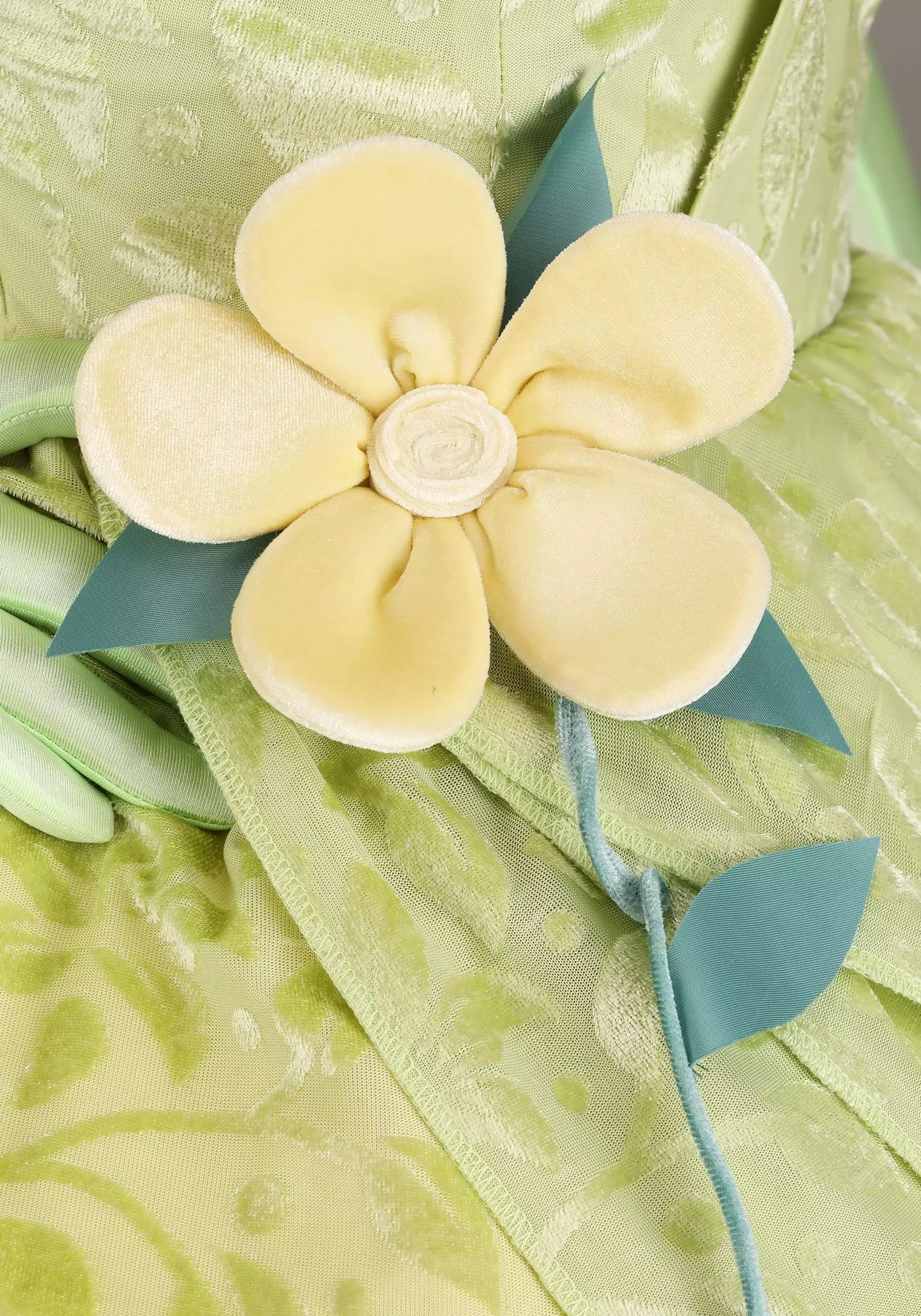 The dress of the costume comes as just one piece but is carefully layered to look exactly like Tiana’s ballgown. Floral patterned velvet combines with satin to give the dress a luxurious appearance and feel while thoughtful shaping of each fabric gives the dress its flower-like look. Color-coordinated Spandex gloves supply the costume a classic elegance. And the included petal crown ties the entire look together!