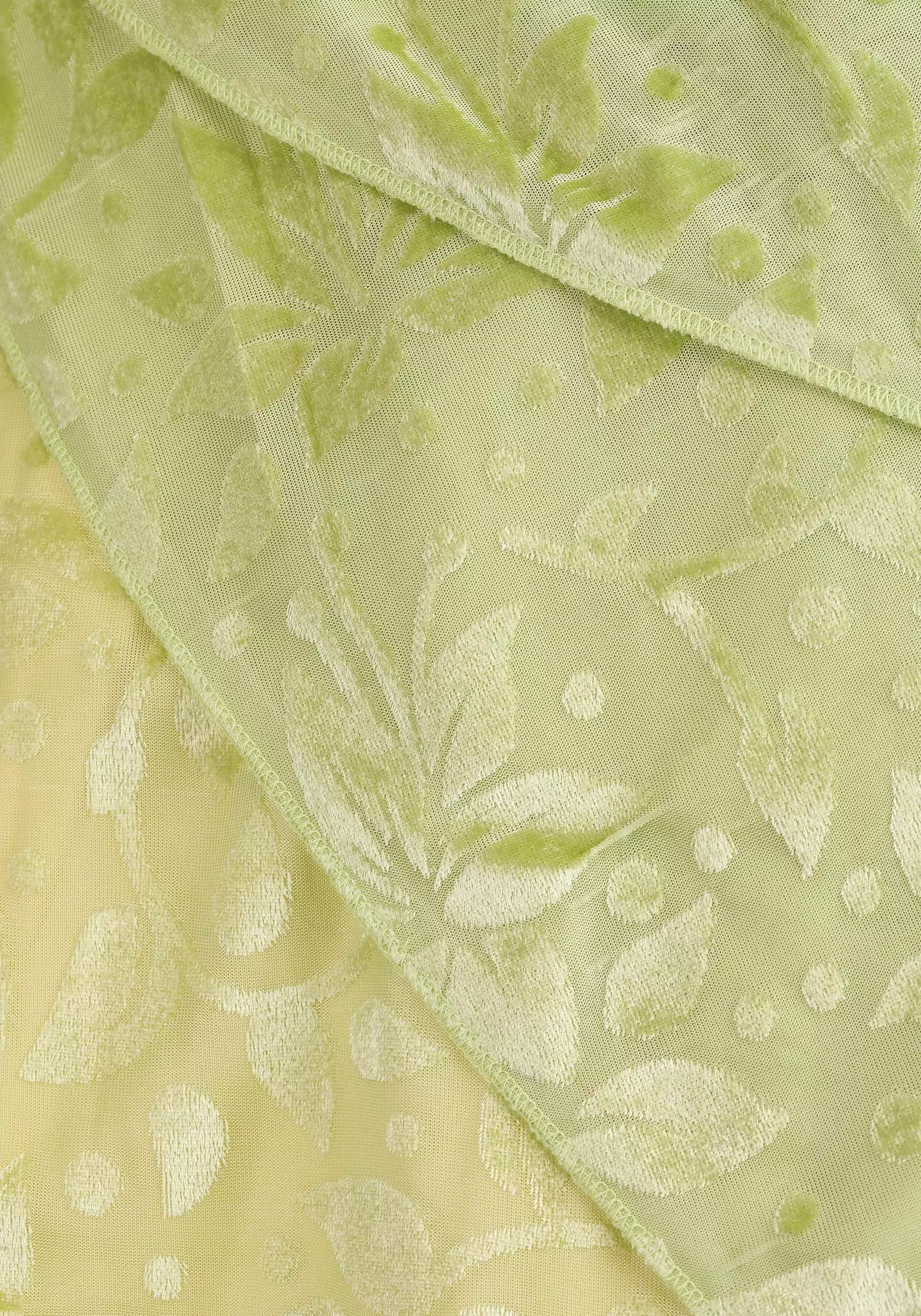 - Dress top layer has velvet fabric w/ burnout petals
