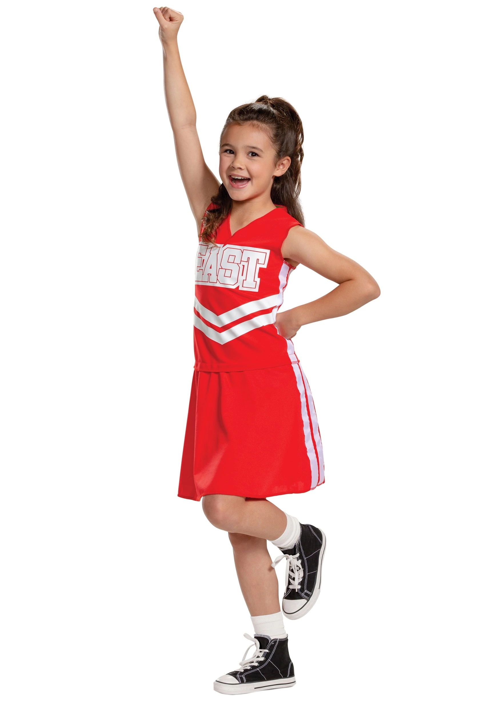 This cheerleader costume is a single piece, making it easy to get in and out of. The red dress features white stripes down the side and across the waist. The top says “East” to represent the Wildcats’ East High School. We recommend pairing this dress with white socks and the tennis shoes of your choice. A hair ribbon wouldn’t go amiss, either! If your little one wants pompoms, too, don’t worry! We’ve got all the cheerleading gear you could ever need on our website.Â