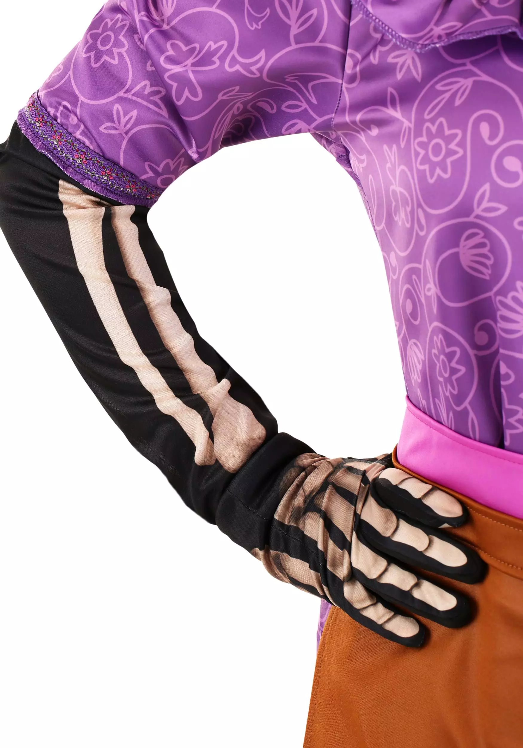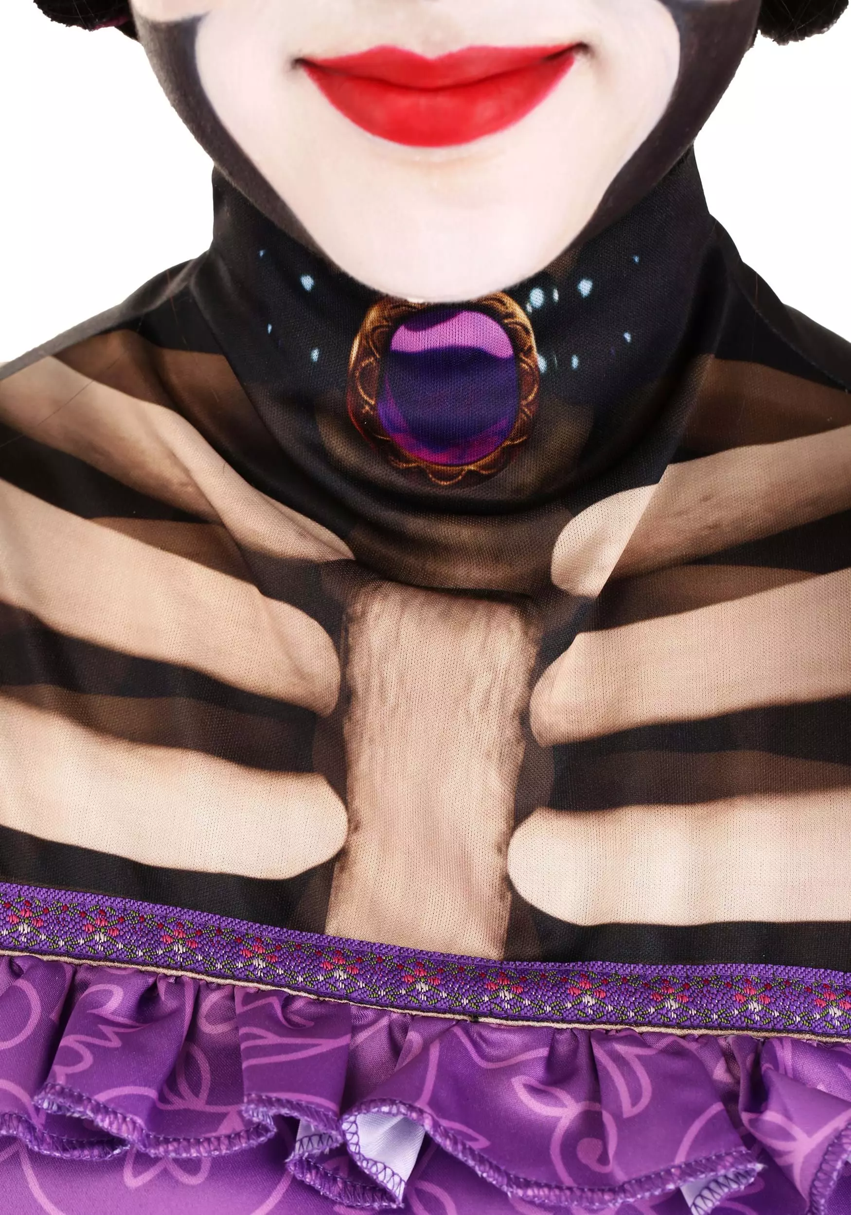 Dance your way into the season with this exclusive and officially licensed Mama Imelda costume from Coco. Your ensemble begins with a detailed purple paisley dress that features ruffled shoulders and skeletal details on the arms and neckline. A faux leather apron keeps you in matriarch style as well. The wig gives you dark black hair with just the right amount of white strands to show how hard you work to keep your family together! Add some face paint to finish your look and you’re ready to bring Coco to life.Â