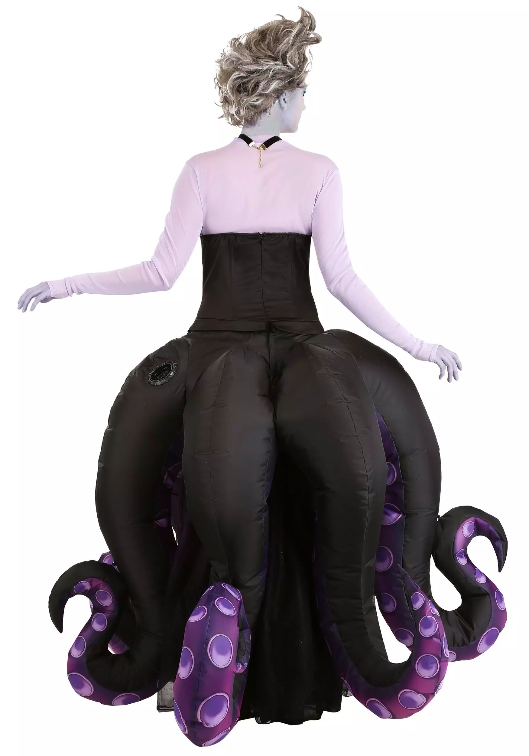 Stretch your tentacles this Halloween in our officially licensed, Prestige Ursula costume from The Little Mermaid! Designed after Disney’s illustrious animation and Pat Carroll’s superb vocal performance, this complete costume begins with a lavender mesh shirt with long sleeves. The black dress features a shiny, sequined bustier and a thigh-length skirt that transforms into layers of sheer black and purple glittery fabric. Stride on land in your Vanessa style and, when you’re ready to take to the seas, breathe life into the inflatable skirt around your waist and stretch out your six exquisitely detailed tentacles (with the help of the magic of four AA batteries, of course). Take hold of the magical conch shell around your neck and you’ll be ready to sing (or steal) your way to the magic trident. If you really want a winning performance, add on some violet body paint and our Sea Witch wig to complete your transformation!