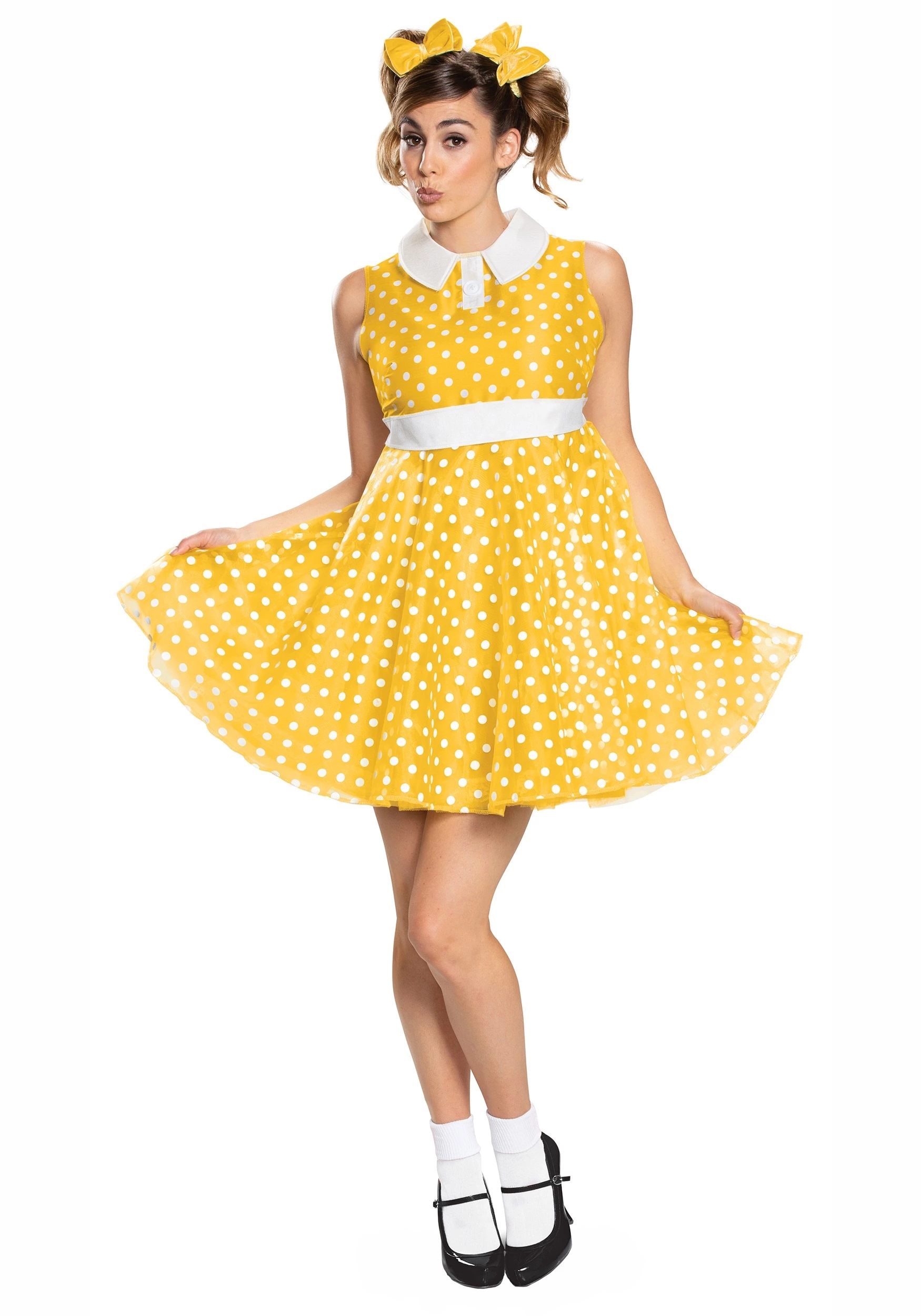 Ready to recite your tea time phrases? A great Gabby Gabby costume will make you ready to hop off the shelf and make new friends. Officially licensed, this Toy Story costume is from the final chapter. The dress has an adorable and flattering baby doll shape. The high cut neck has a curved white collar and high waistband. The skirt flares out, making twirling extra fun. The bright yellow polka dot fabric is adorable, retro, and rather photogenic. Pair this dress with pigtails, white ankle socks, and a character shoe to make yourself tea time ready.