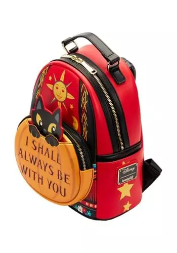 This officially licensed Disney Hocus Pocus Dani Binx Loungefly Mini Backpack is just what you need for holding Halloween, candy, your lucky rat tail, or even an extra smart cat! The red faux leather backpack has a front pocket shaped like a pumpkin, from which a cat’s paws and head are peeking out. The straps are length-adjustable.