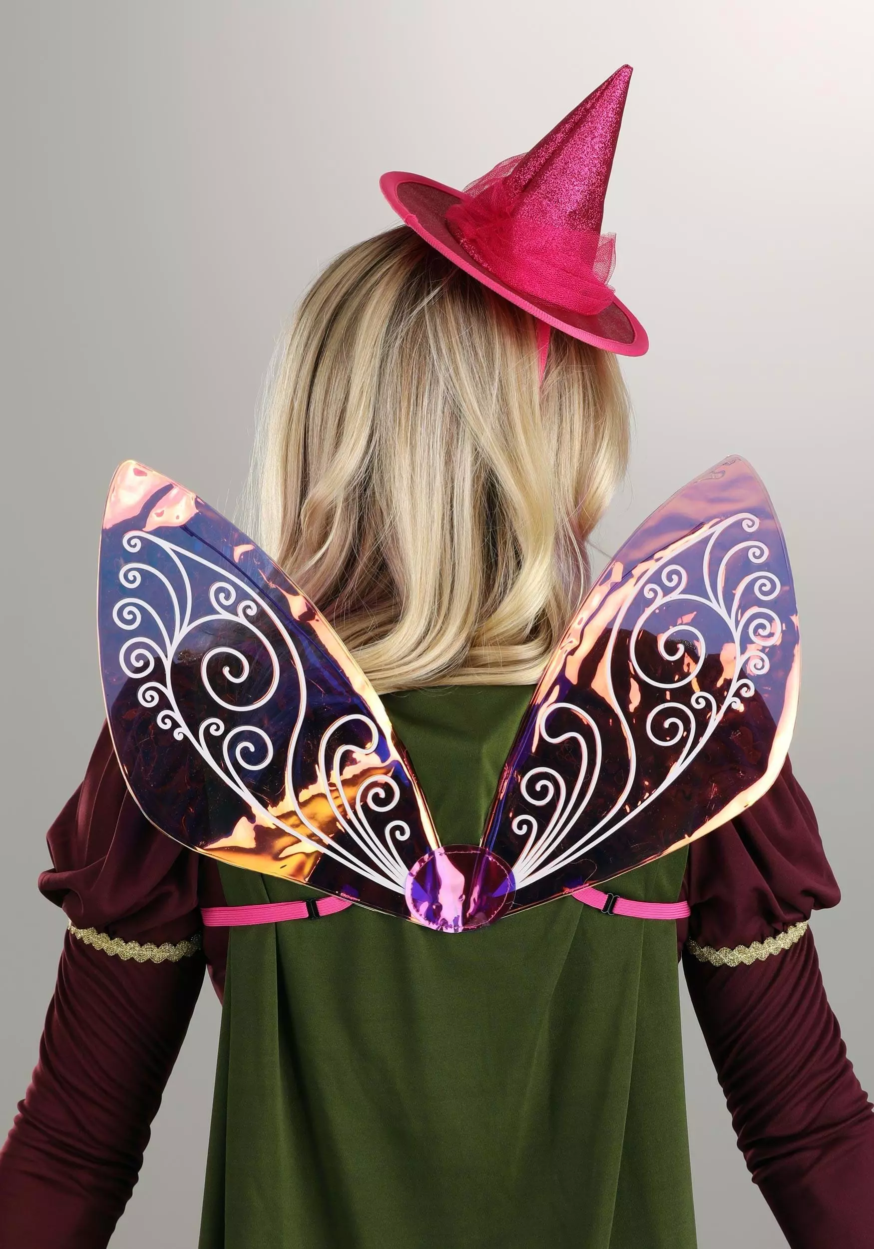 Everyone will know that you’re a good fairy when you wear this exclusive, officially licensed Disney Flora the Fairy Headband and Wings Kit! A mini pink hat with a pointed crown and a gauzy ribbon band perches perkily on your head thanks to the attached cloth-covered headband. The matching wings secure over your shoulders with adjustable straps and have a lovely swirl design.