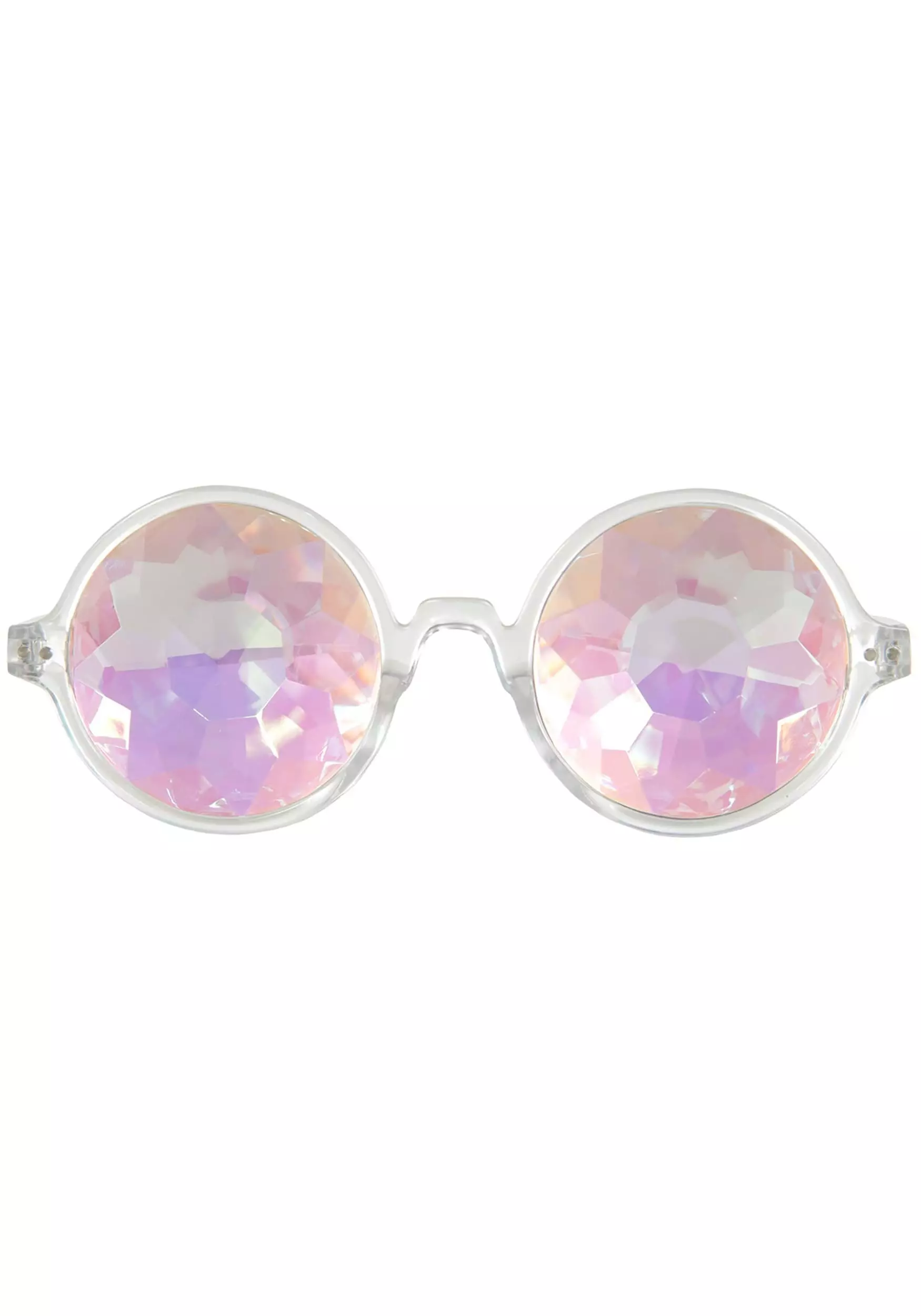 - Clear plastic eyeglass frames have iridescent faceted lenses–will limit vision