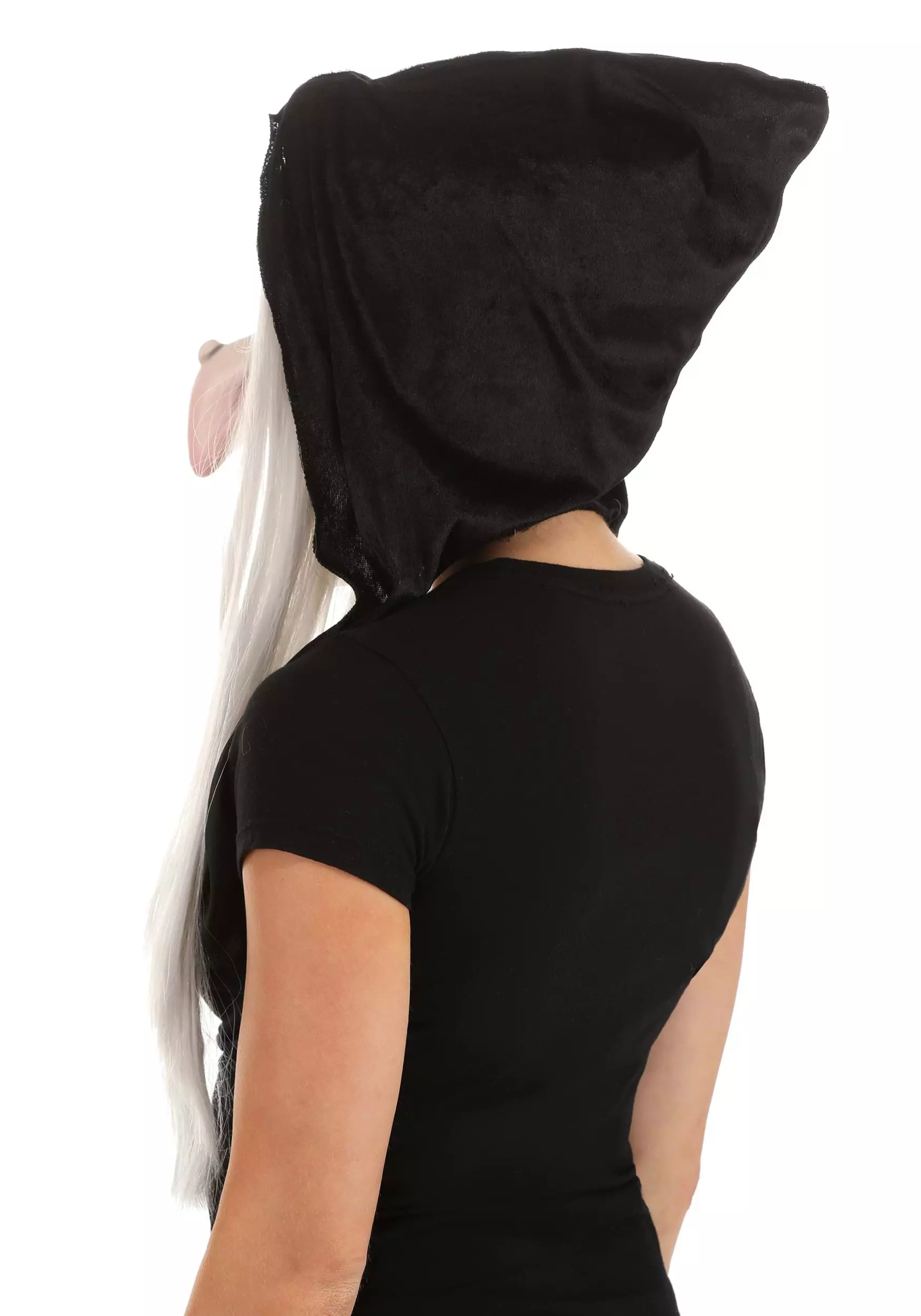 - Mask has attached velour hood & stringy white hair