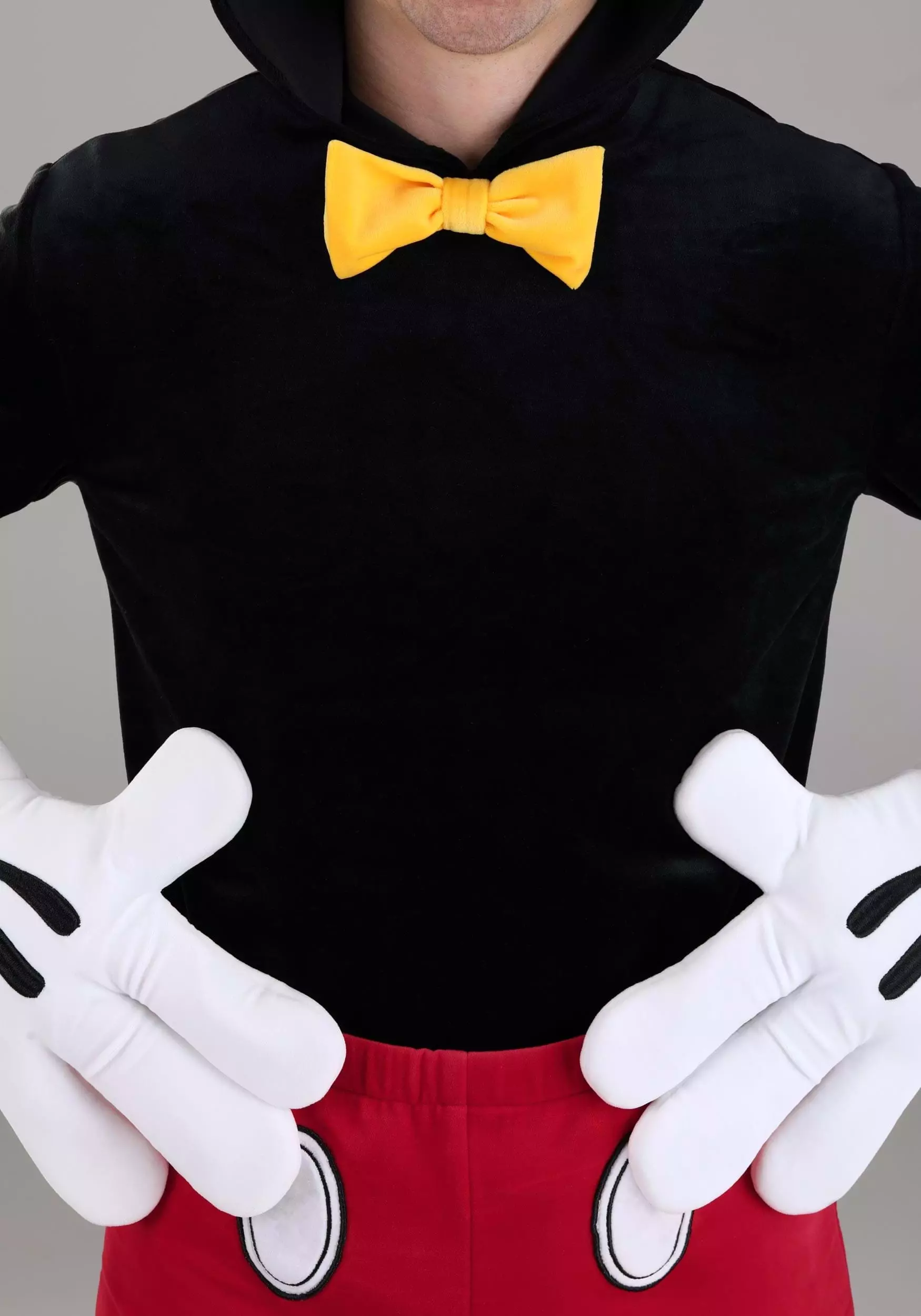 Next is a hooded shirt that includes a charming yellow bow tie and Mickey’s ears on the hood. The stuffed white gloves and yellow shoe covers provide the finishing details. You’ll look and feel just like this classic character whenever you put on this charming costume!