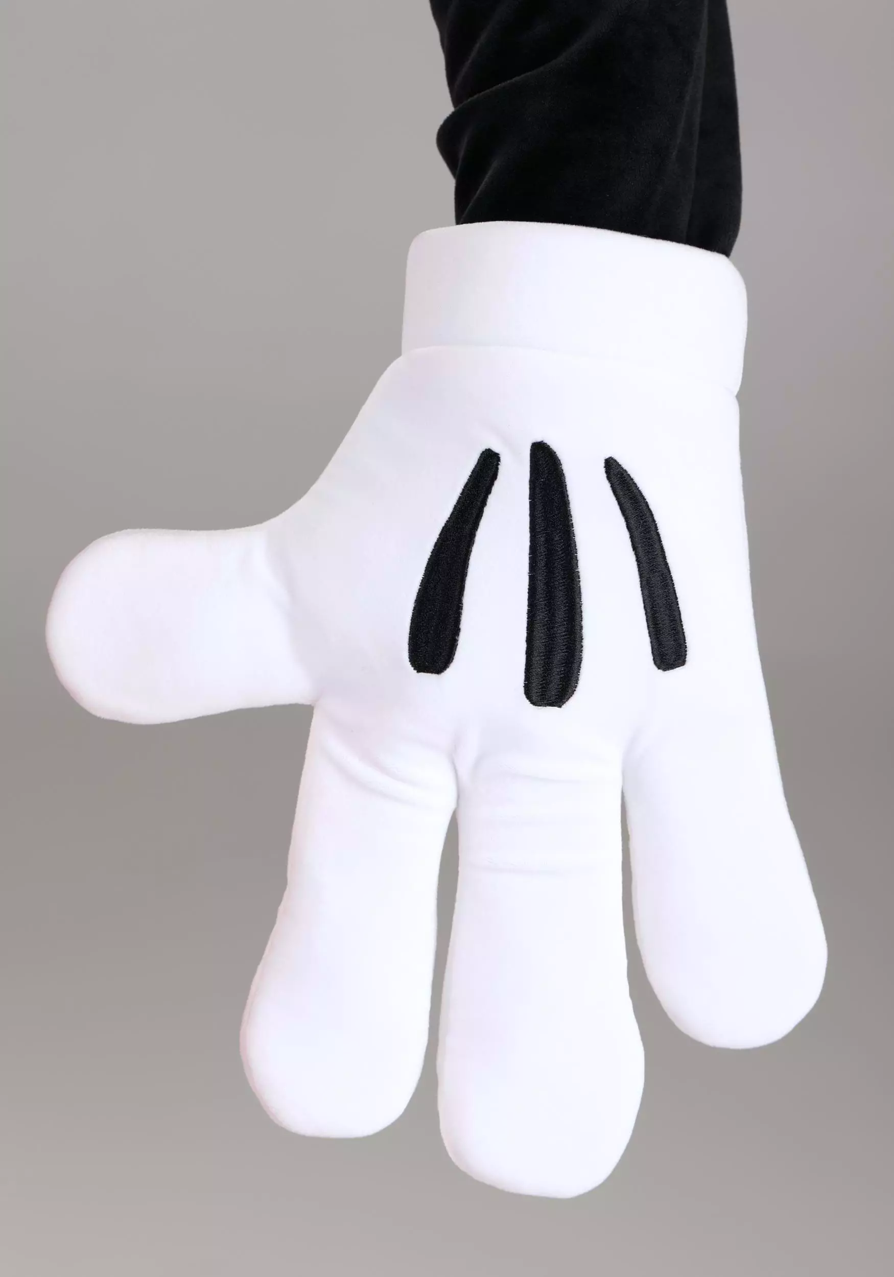 - White plush gloves have foam backing, embroidered details