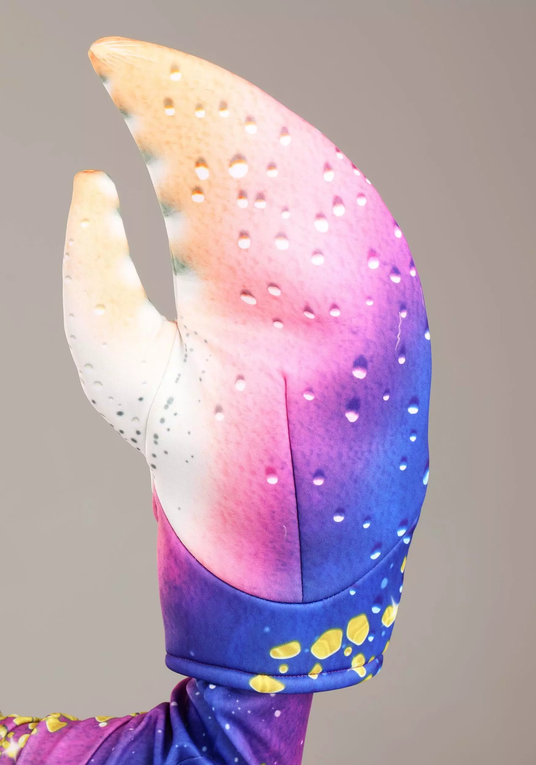 A soft-sculpted hood secures under the chin with hook-and-loop fasteners and creates a crabby profile. Mittens and shoe covers turn hands and feet into claws. And the piece de resistance comes in the form of a golden shell that can be worn over the costume or whenever your child is feeling like sporting some extra shine.